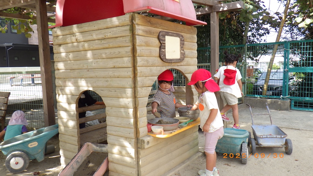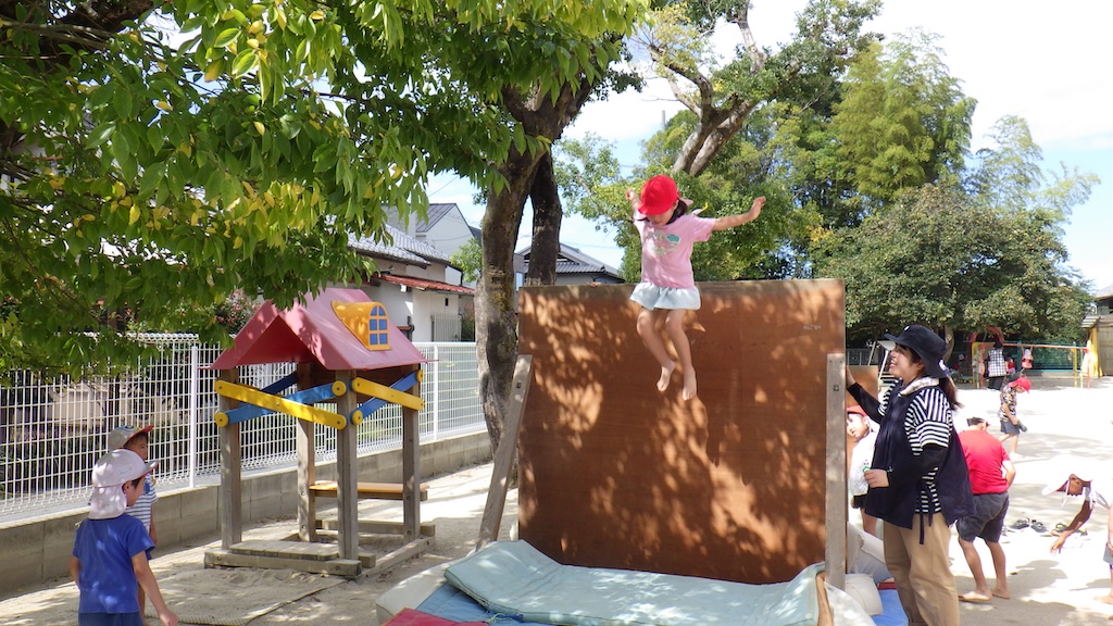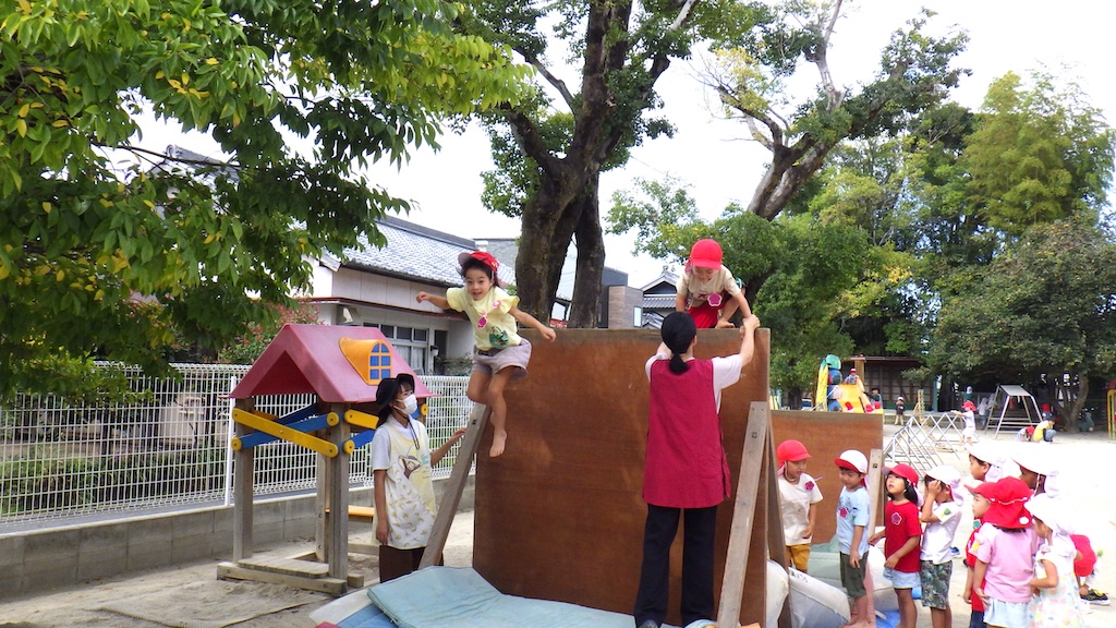 園庭に竹の子幼稚園オリジナルの遊具の