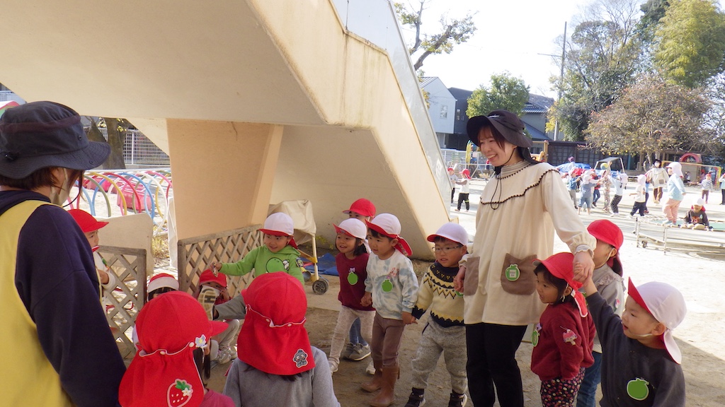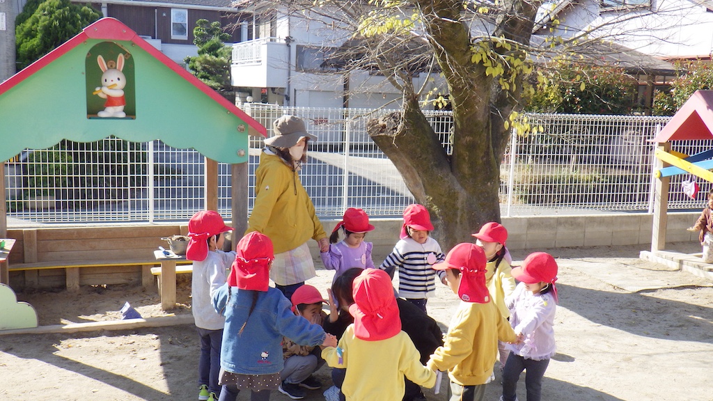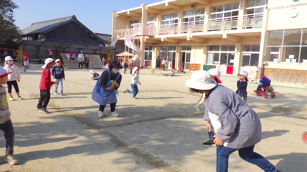 年少さんが先生と伝承遊びを楽しんでいました。昔ながらのあそびの姿に、心がほんわかしました。
