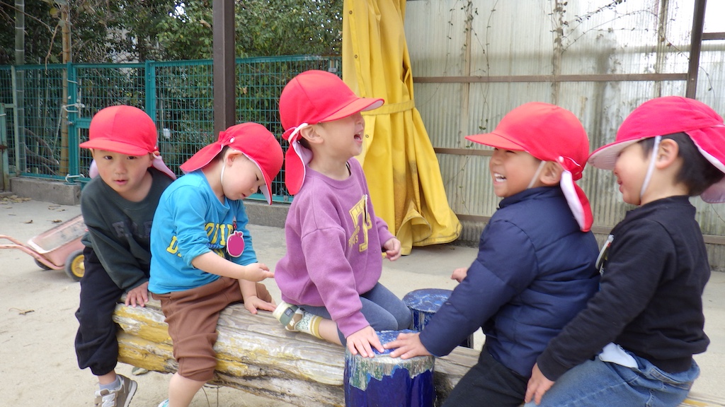 丸太に座ってジャンケン遊びが自然と始まっていました。