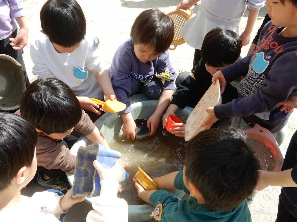 年中さんは、砂場の遊具などを綺麗に洗って
